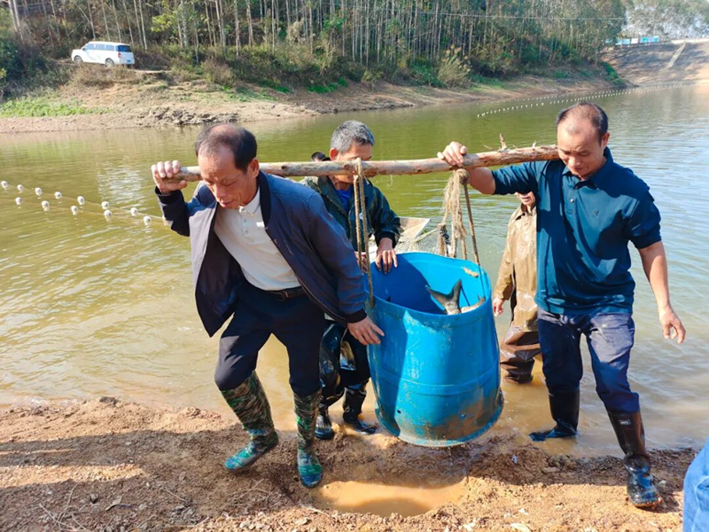 “欧阳水库周边生态环境优秀,水质清澈见底,具有开展生态饲养的天然优势。”四排镇马龙村党总支书梁尚海介绍,为找准富民强村的突破口,村“两委”班子带队多方调研调查、重复证明,既算清“经济账”,更算好“生态账”,终究敲定在欧阳水库打造“生态渔场”项目。