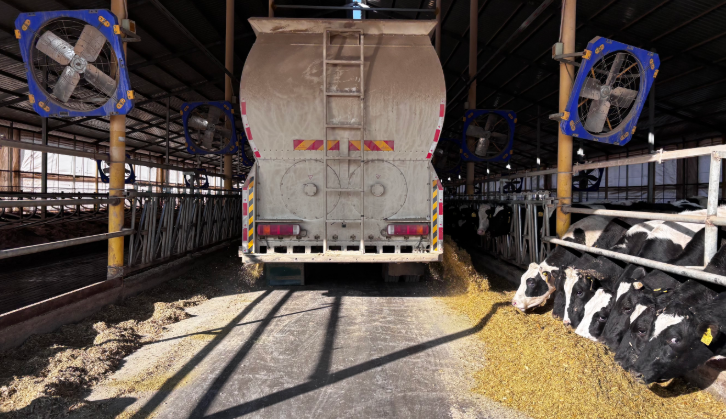 “本年咱们11月就收了11万吨青贮玉米,按每头牛每天30公斤算,能撑到下一年年末!”草场出产场长周帅一边查看饲料配比系统,一边笑着介绍。在他死后,自动化配料车间正高速工作,精准饲喂系统将科学配比的“养分套餐”经过管道输送到各个牛舍,每一头牛都能吃上量身定做的“星级餐”。